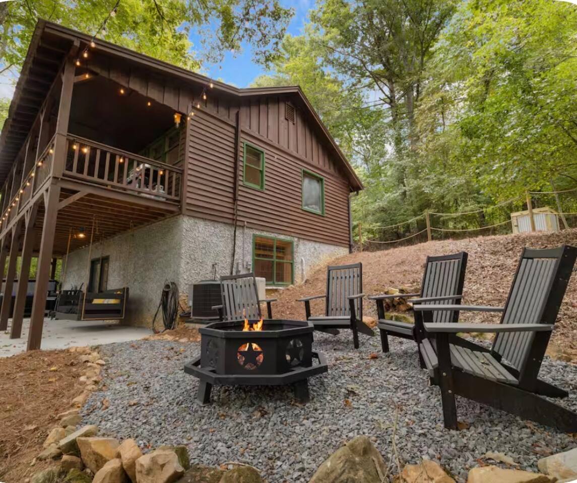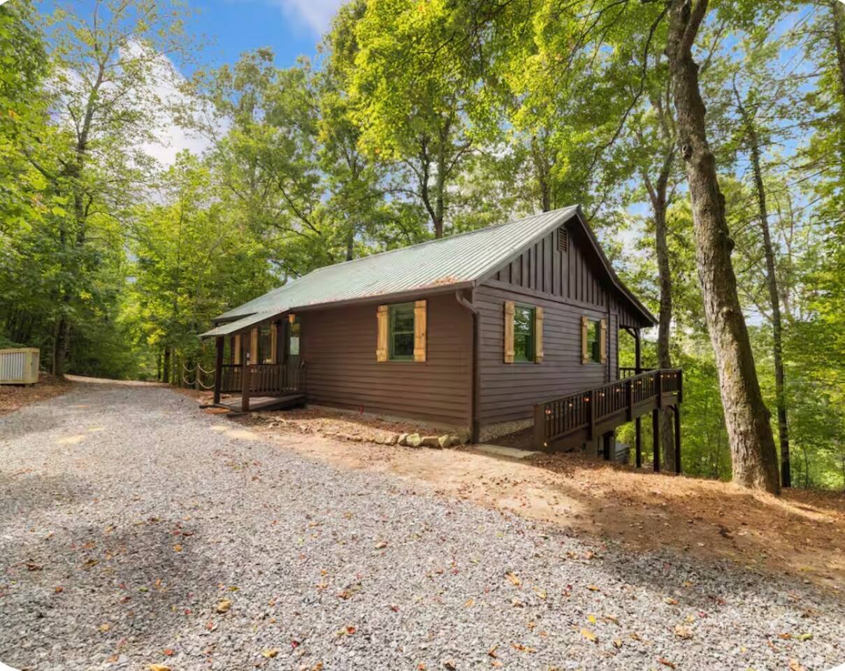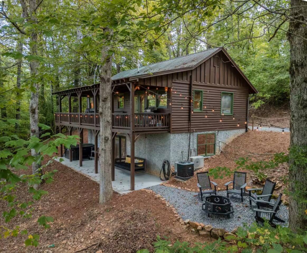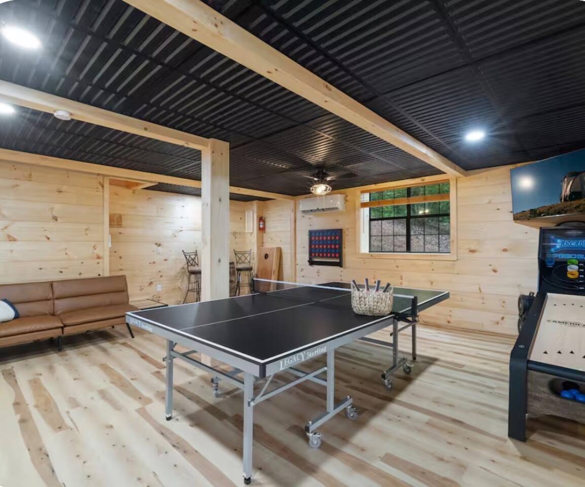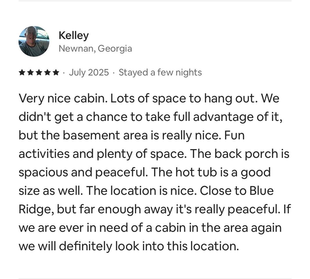 🏡 THE SPACE Tucked in the trees but close to everything, this cabin is designed for relaxation, connection, and a little fun competition. Start your mornings on the expansive deck with coffee in hand, windows open, mountain air rolling in. Evenings? That’s where this place shines… hot tub bubbling, fire crackling, stars putting on a full show. Inside, you’ll find a cozy living space with an electric fireplace and streaming-ready Roku TV, plus a fully stocked kitchen for easy meals at home. ⸻ 🎯 WHY YOU’LL LOVE IT • Hot tub under the stars • Fire pit for s’mores & stories • Game room: ping pong + skee-ball+ Darts • Pet friendly 🐾 • Easy roads (no stress getting there) • 10 mins to Downtown Blue Ridge • Spacious deck surrounded by trees ⸻ 🛏️ SLEEPING SETUP Designed for groups without feeling crowded: • Main level king bedroom • Bunk room with full over twin bunk and additional twin bed. • Terrace level king suite + ensuite bath • Futon + sofa for extra guests All beds feature comfortable linens that actually feel good after a long day exploring. 🛁 Bathrooms: • Shampoo, Conditioner, and Body wash provided. • Walk in showers for easy access • Washer and Dryer with Laundry pods. ⸻ 🍳 KITCHEN + DINING Fully stocked kitchen with everything you need: • Stainless steel appliances • Drip coffee maker + crockpot (Bring your own coffee) • Toaster, blender, essentials • Dining table + island seating • Outdoor grill + deck dining Cook in… or bring takeout back and eat under the trees. ⸻ 🎮 ENTERTAINMENT This isn’t a “sit quietly and scroll your phone” cabin (unless you want it to be): • Ping pong tournaments • Skee-ball showdowns • Roku TVs throughout • Fire pit hangouts • Hot tub resets ⸻ 🐾 PET FRIENDLY Bring your dogs… they’ll love it here just as much as you do. ⸻ 📍 LOCATION You get the best of both worlds: • 10 minutes to Downtown Blue Ridge • Close to wineries, hiking, and the Toccoa River • Near Mercier Orchards, shops, and restaurants • Easy access roads (huge plus for guests) ⸻ ⚠️ GOOD TO KNOW You’re in the mountains, not a subdivision: Wildlife sightings can happen (deer, birds, maybe even a bear). Keep food secured and enjoy nature from a respectful distance. ⸻ ✨ CLOSING LINE This isn’t just a place to stay… it’s where mornings are slow, nights last longer, and nobody wants to leave.