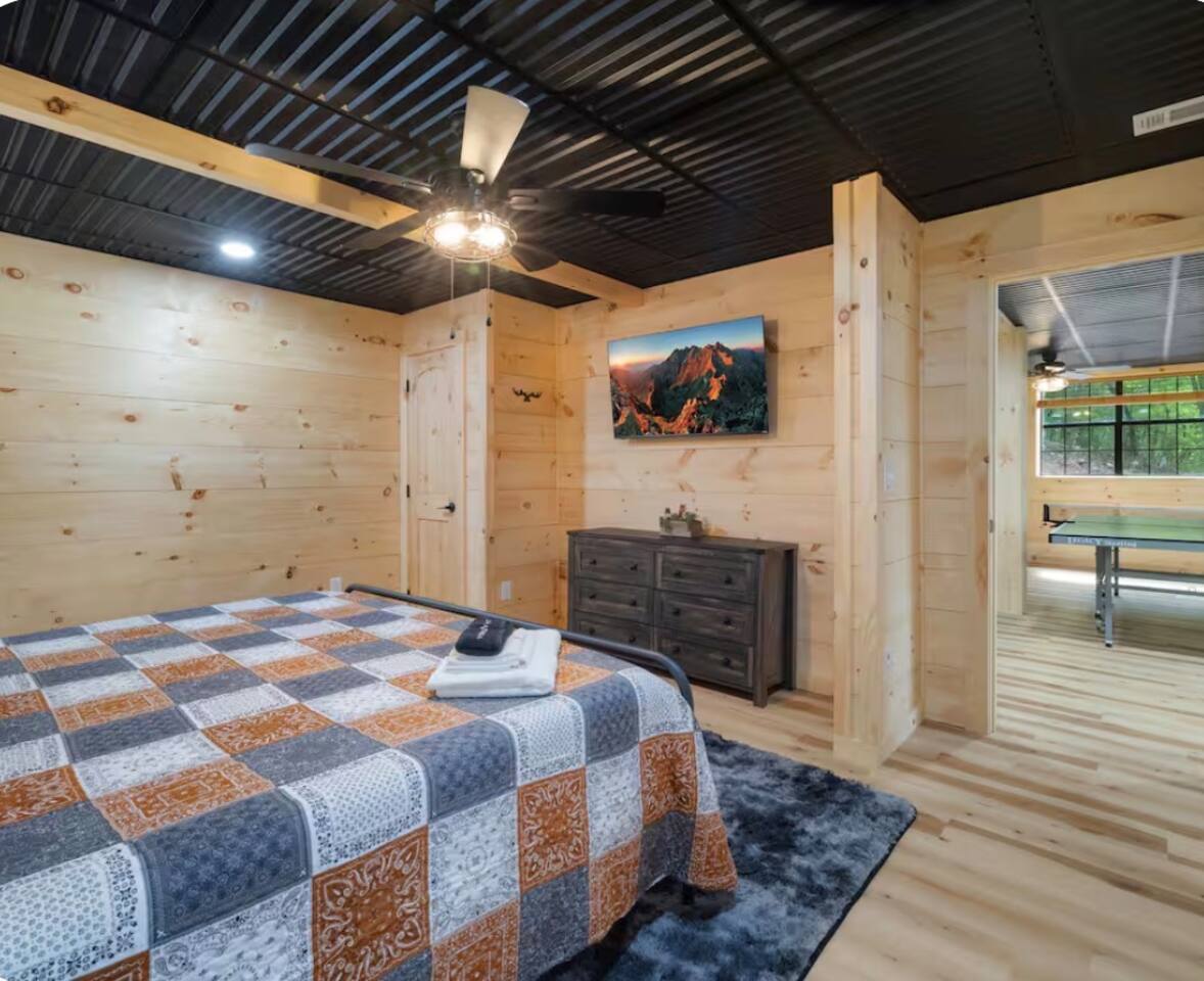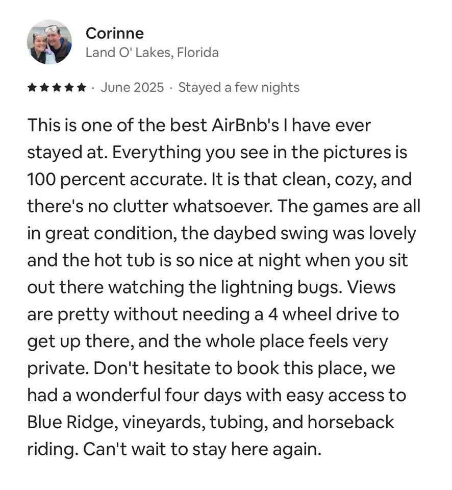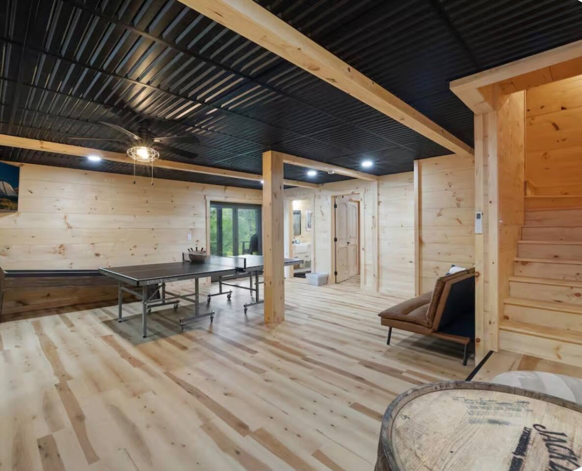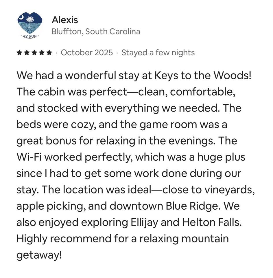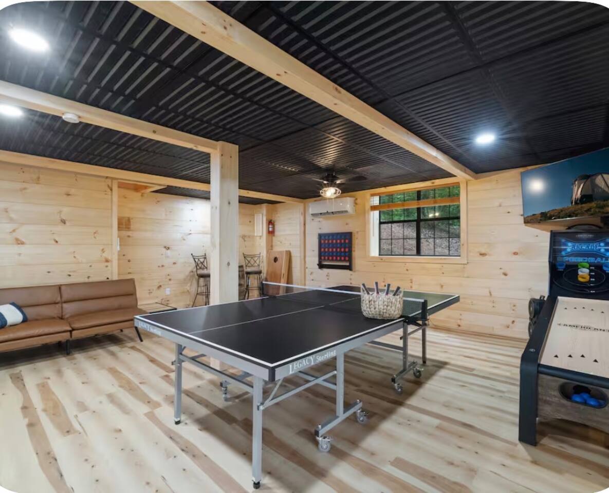 🏡 THE SPACE Tucked in the trees but close to everything, this cabin is designed for relaxation, connection, and a little fun competition. Start your mornings on the expansive deck with coffee in hand, windows open, mountain air rolling in. Evenings? That’s where this place shines… hot tub bubbling, fire crackling, stars putting on a full show. Inside, you’ll find a cozy living space with an electric fireplace and streaming-ready Roku TV, plus a fully stocked kitchen for easy meals at home. ⸻ 🎯 WHY YOU’LL LOVE IT • Hot tub under the stars • Fire pit for s’mores & stories • Game room: ping pong + skee-ball+ Darts • Pet friendly 🐾 • Easy roads (no stress getting there) • 10 mins to Downtown Blue Ridge • Spacious deck surrounded by trees ⸻ 🛏️ SLEEPING SETUP Designed for groups without feeling crowded: • Main level king bedroom • Bunk room with full over twin bunk and additional twin bed. • Terrace level king suite + ensuite bath • Futon + sofa for extra guests All beds feature comfortable linens that actually feel good after a long day exploring. 🛁 Bathrooms: • Shampoo, Conditioner, and Body wash provided. • Walk in showers for easy access • Washer and Dryer with Laundry pods. ⸻ 🍳 KITCHEN + DINING Fully stocked kitchen with everything you need: • Stainless steel appliances • Drip coffee maker + crockpot (Bring your own coffee) • Toaster, blender, essentials • Dining table + island seating • Outdoor grill + deck dining Cook in… or bring takeout back and eat under the trees. ⸻ 🎮 ENTERTAINMENT This isn’t a “sit quietly and scroll your phone” cabin (unless you want it to be): • Ping pong tournaments • Skee-ball showdowns • Roku TVs throughout • Fire pit hangouts • Hot tub resets ⸻ 🐾 PET FRIENDLY Bring your dogs… they’ll love it here just as much as you do. ⸻ 📍 LOCATION You get the best of both worlds: • 10 minutes to Downtown Blue Ridge • Close to wineries, hiking, and the Toccoa River • Near Mercier Orchards, shops, and restaurants • Easy access roads (huge plus for guests) ⸻ ⚠️ GOOD TO KNOW You’re in the mountains, not a subdivision: Wildlife sightings can happen (deer, birds, maybe even a bear). Keep food secured and enjoy nature from a respectful distance. ⸻ ✨ CLOSING LINE This isn’t just a place to stay… it’s where mornings are slow, nights last longer, and nobody wants to leave.