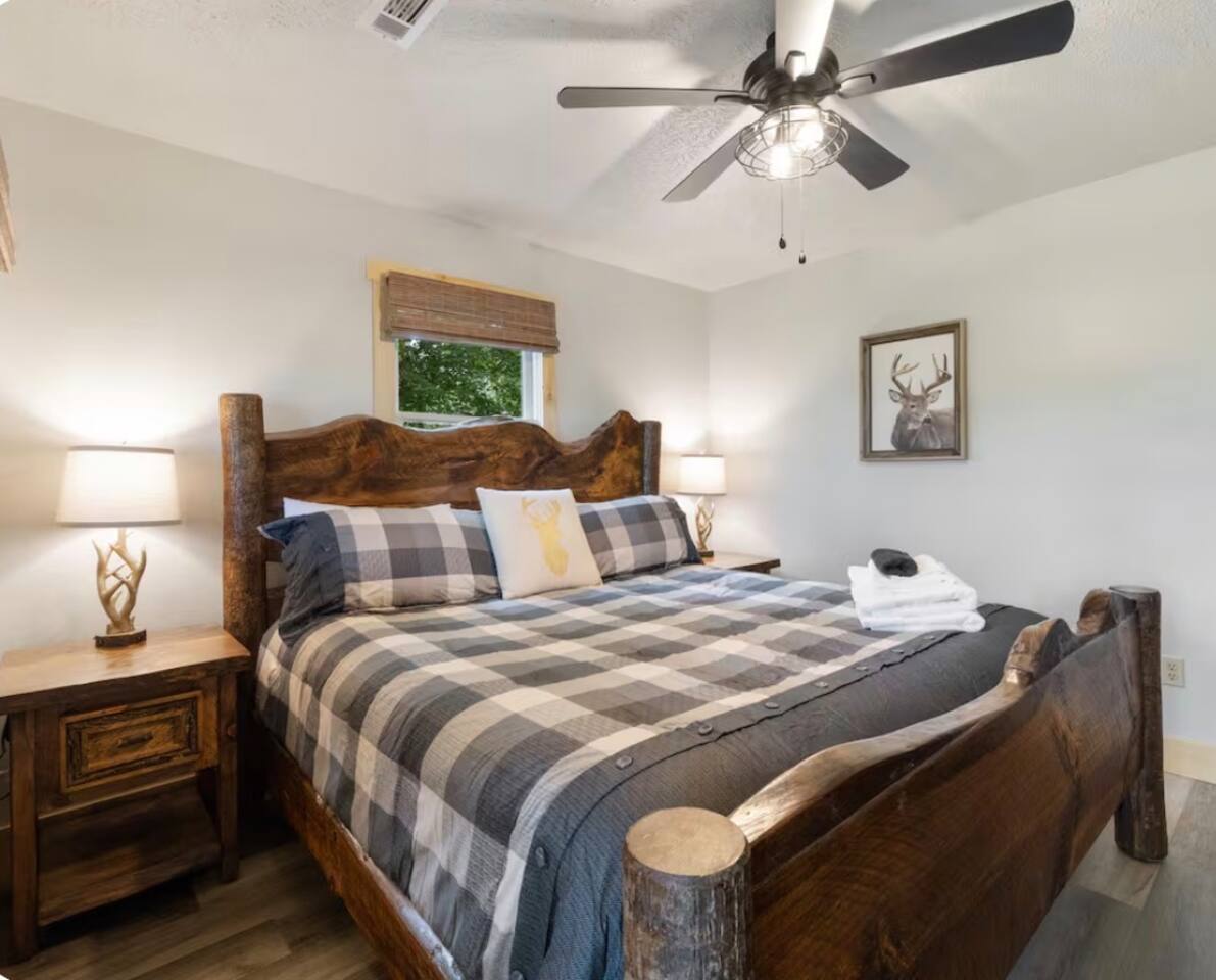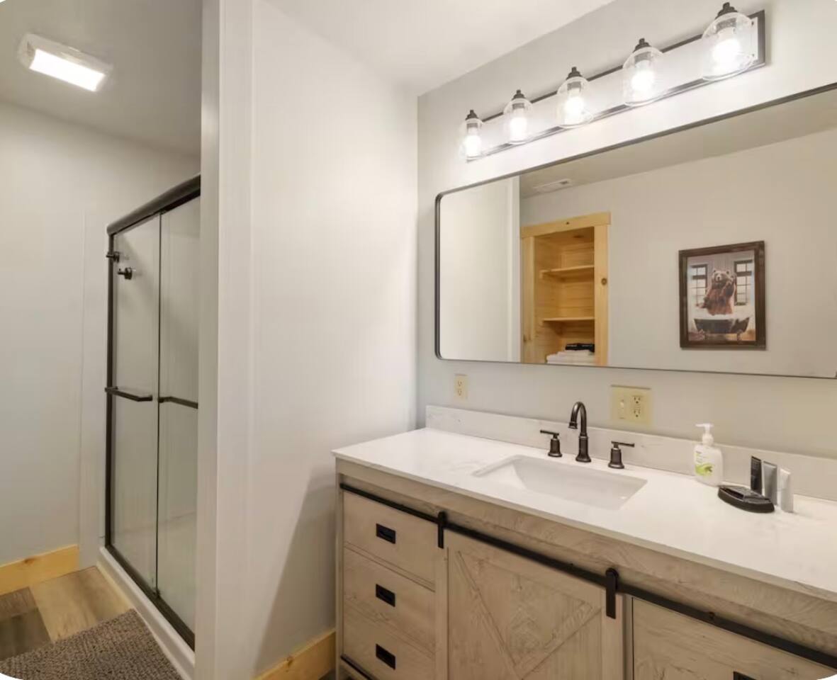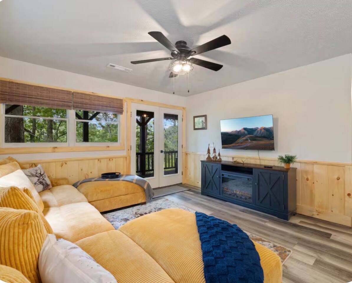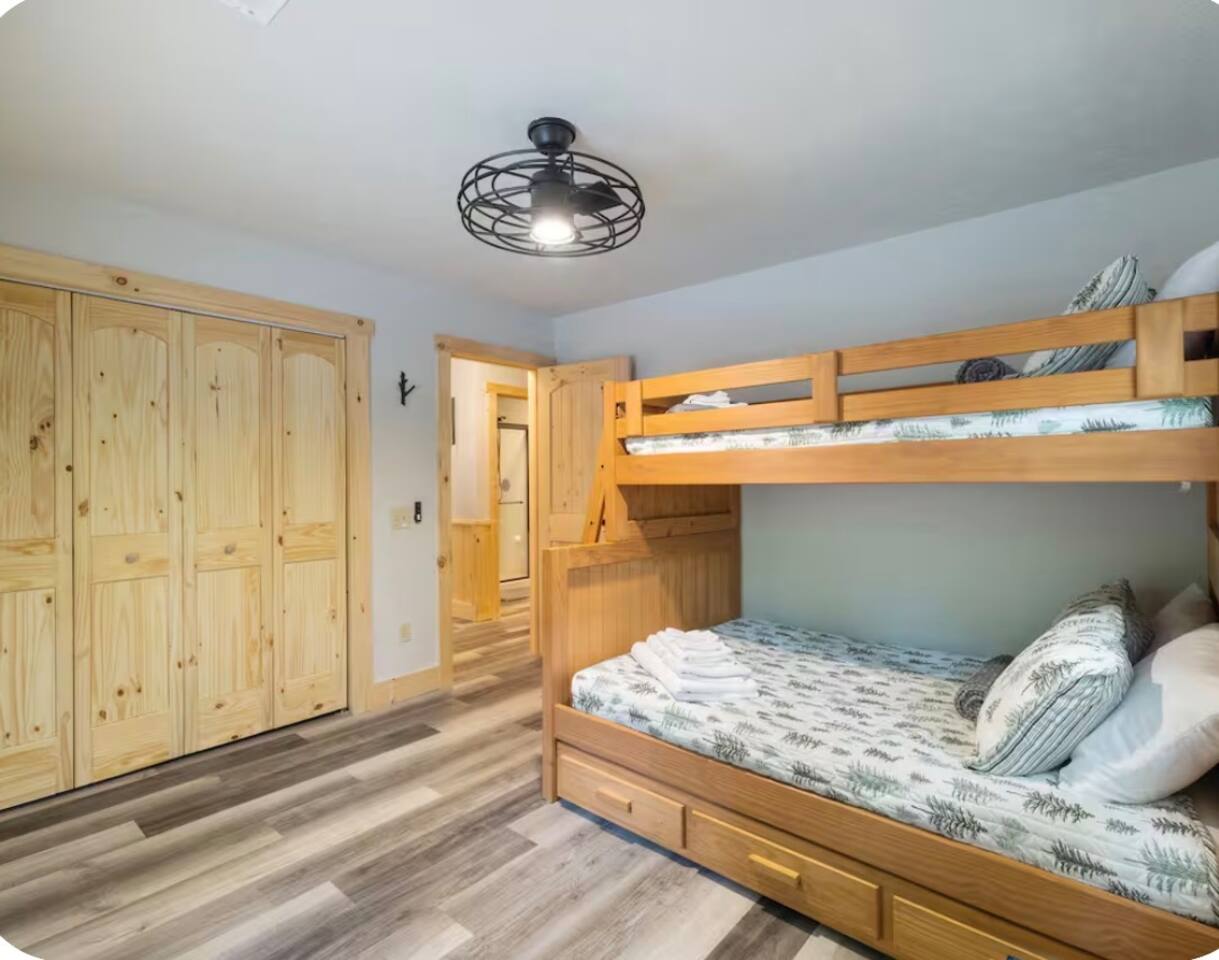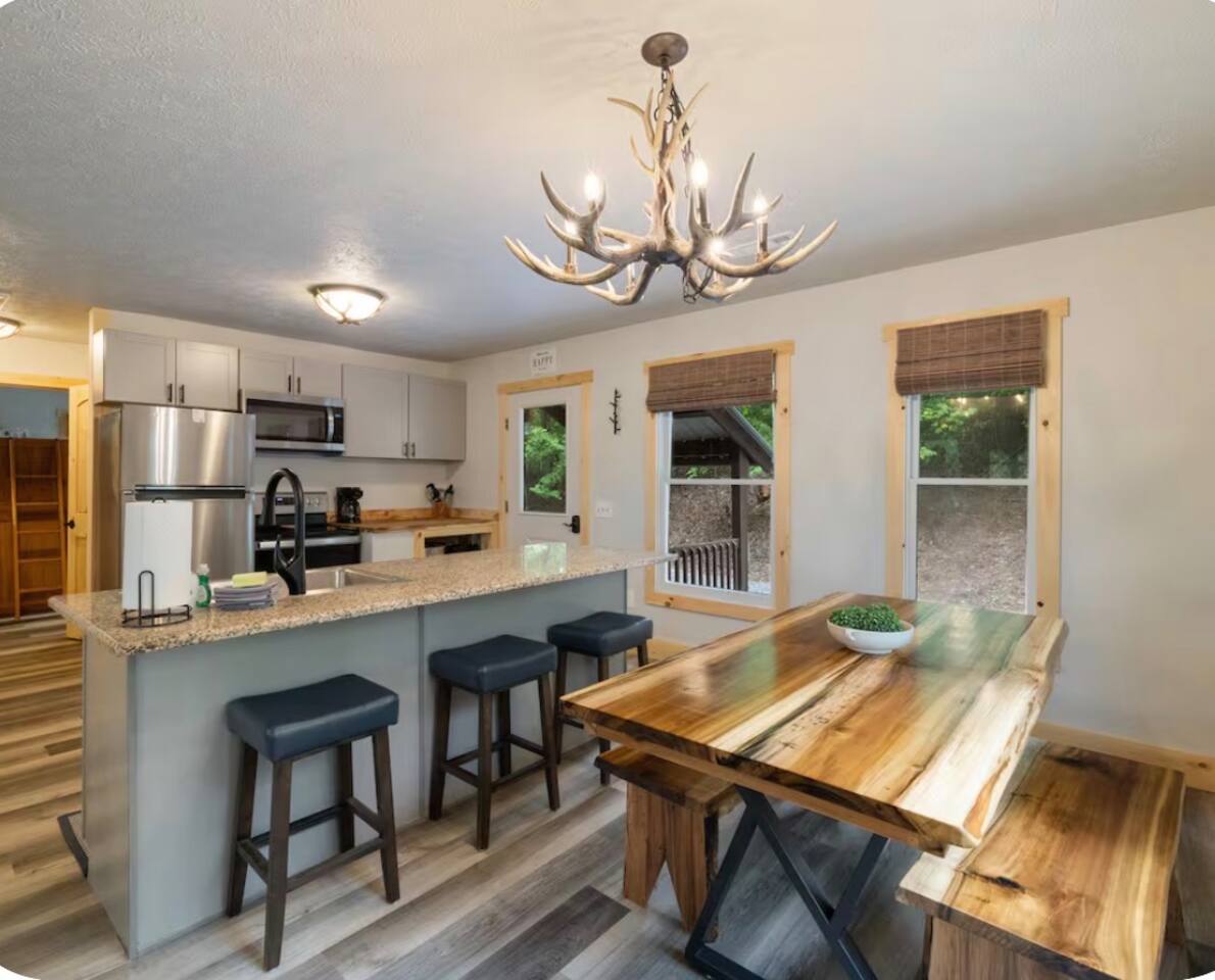 🏡 THE SPACE Tucked in the trees but close to everything, this cabin is designed for relaxation, connection, and a little fun competition. Start your mornings on the expansive deck with coffee in hand, windows open, mountain air rolling in. Evenings? That’s where this place shines… hot tub bubbling, fire crackling, stars putting on a full show. Inside, you’ll find a cozy living space with an electric fireplace and streaming-ready Roku TV, plus a fully stocked kitchen for easy meals at home. ⸻ 🎯 WHY YOU’LL LOVE IT • Hot tub under the stars • Fire pit for s’mores & stories • Game room: ping pong + skee-ball+ Darts • Pet friendly 🐾 • Easy roads (no stress getting there) • 10 mins to Downtown Blue Ridge • Spacious deck surrounded by trees ⸻ 🛏️ SLEEPING SETUP Designed for groups without feeling crowded: • Main level king bedroom • Bunk room with full over twin bunk and additional twin bed. • Terrace level king suite + ensuite bath • Futon + sofa for extra guests All beds feature comfortable linens that actually feel good after a long day exploring. 🛁 Bathrooms: • Shampoo, Conditioner, and Body wash provided. • Walk in showers for easy access • Washer and Dryer with Laundry pods. ⸻ 🍳 KITCHEN + DINING Fully stocked kitchen with everything you need: • Stainless steel appliances • Drip coffee maker + crockpot (Bring your own coffee) • Toaster, blender, essentials • Dining table + island seating • Outdoor grill + deck dining Cook in… or bring takeout back and eat under the trees. ⸻ 🎮 ENTERTAINMENT This isn’t a “sit quietly and scroll your phone” cabin (unless you want it to be): • Ping pong tournaments • Skee-ball showdowns • Roku TVs throughout • Fire pit hangouts • Hot tub resets ⸻ 🐾 PET FRIENDLY Bring your dogs… they’ll love it here just as much as you do. ⸻ 📍 LOCATION You get the best of both worlds: • 10 minutes to Downtown Blue Ridge • Close to wineries, hiking, and the Toccoa River • Near Mercier Orchards, shops, and restaurants • Easy access roads (huge plus for guests) ⸻ ⚠️ GOOD TO KNOW You’re in the mountains, not a subdivision: Wildlife sightings can happen (deer, birds, maybe even a bear). Keep food secured and enjoy nature from a respectful distance. ⸻ ✨ CLOSING LINE This isn’t just a place to stay… it’s where mornings are slow, nights last longer, and nobody wants to leave.
