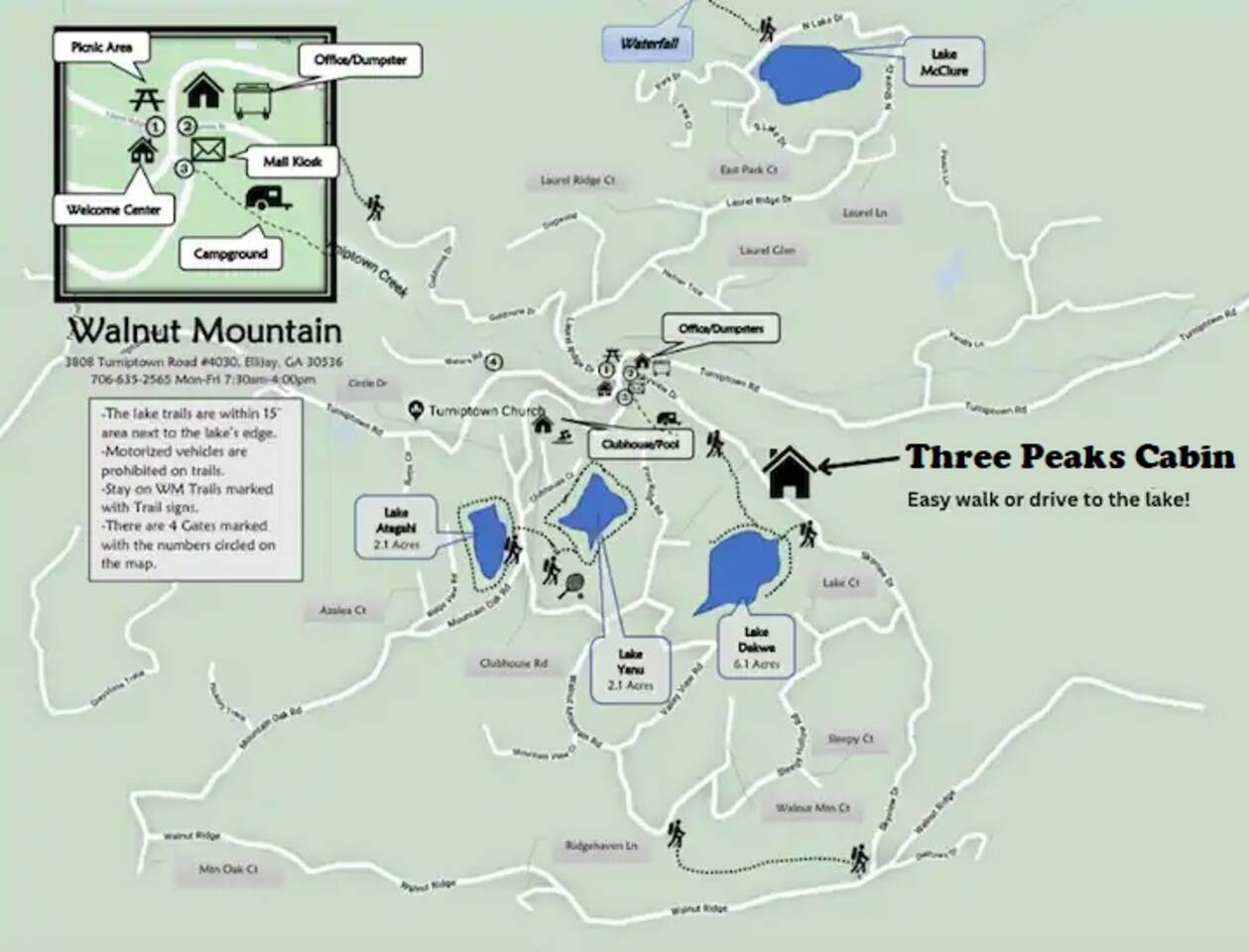 Guest access Walnut Mountain is a gated community. The best access to the property is through gate 2, which GPS navigation should take you directly to. An access code for the gate will be provided 48 hrs prior to check in. Once at the property, there will be a gate key for you to use for the duration of your stay. The property provides parking space for 5-6 vehicles. Please note that there is level parking for 2 vehicles in the main section of the driveway. The lower portion of the driveway has room for an additional 3-4 vehicles, but due to the steeper grade of this section of driveway it is recommended that this area be reserved for 4-wheel drive vehicles in case of slick weather conditions. Other things to note Guests also have access to all the community amenities. These include an outdoor community swimming pool (open Memorial Day weekend to Labor Day weekend), playground, tennis courts, a basketball court and a picnic area. Bring your canoe, kayak, and/or fishing poles to take advantage of the 4 private lakes in the community that are home to bass, catfish, and brim! The largest of these lakes is only 200 yards from the cabin! Last, but not least, enjoy a nature walk on one of the many hiking trails, including a waterfall hike.
